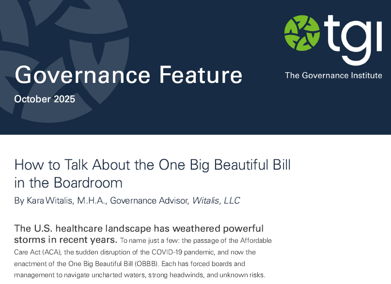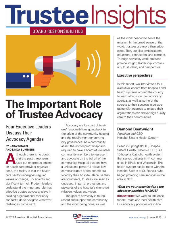 Here we hand the mic over to four board chairs from across the country to hear what’s on their minds as it pertains to the opportunities and challenges for the current and future state of health care, as well as the nuts and bolts of governance and leadership.